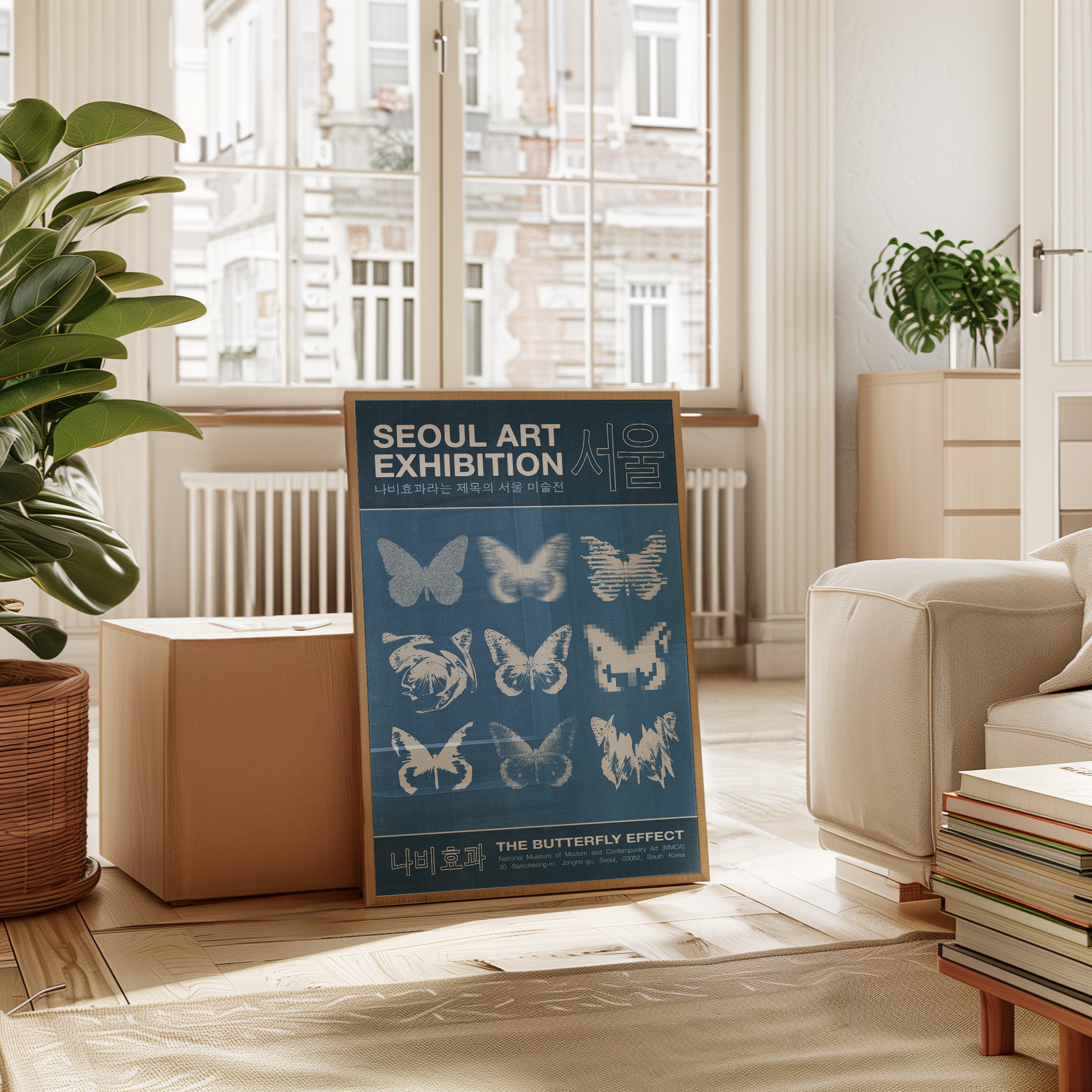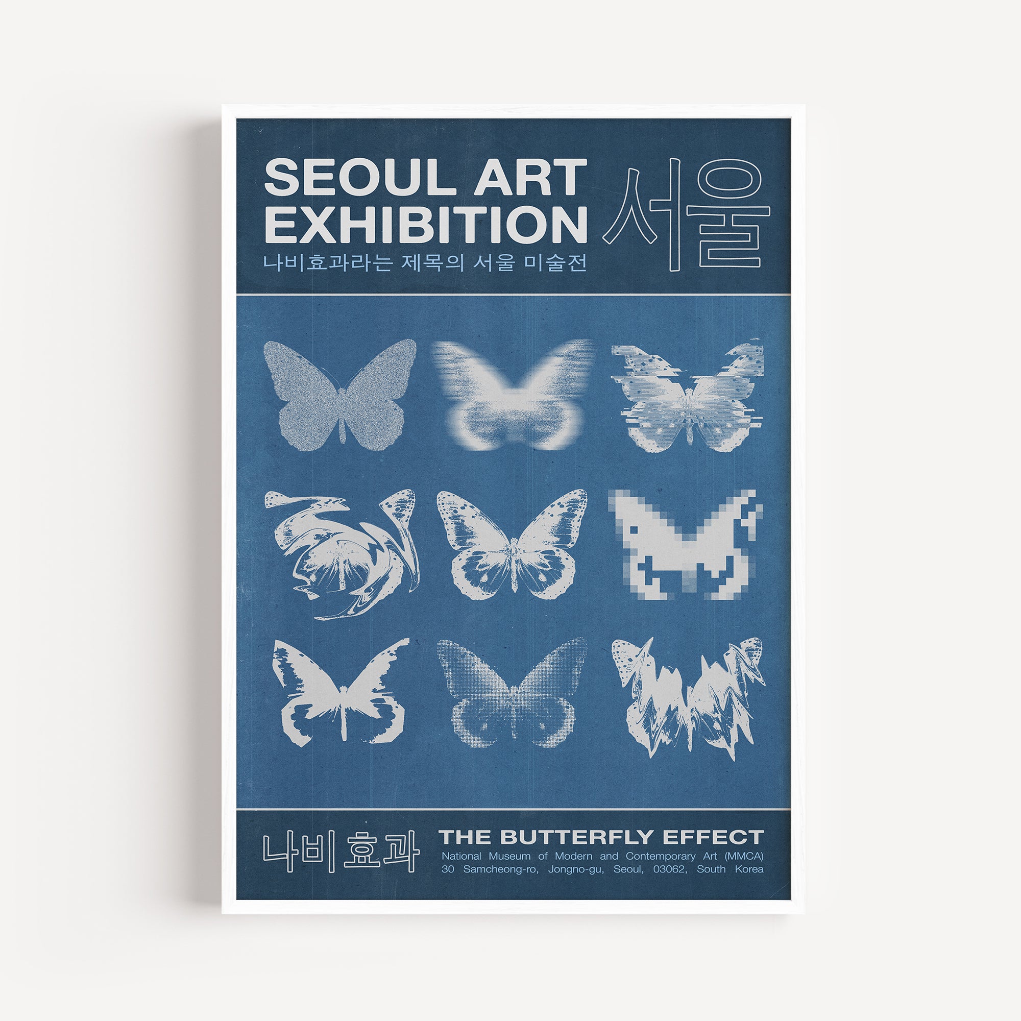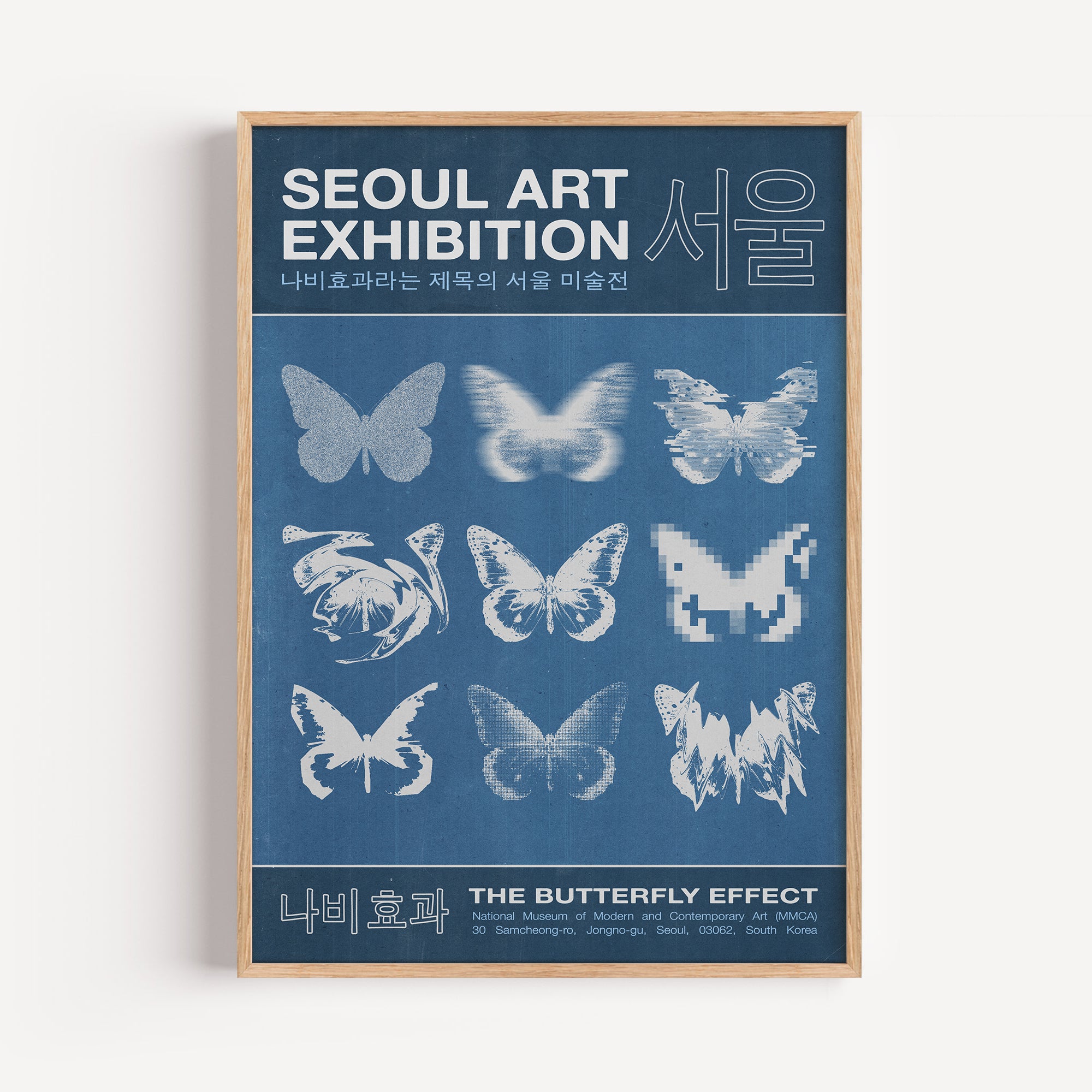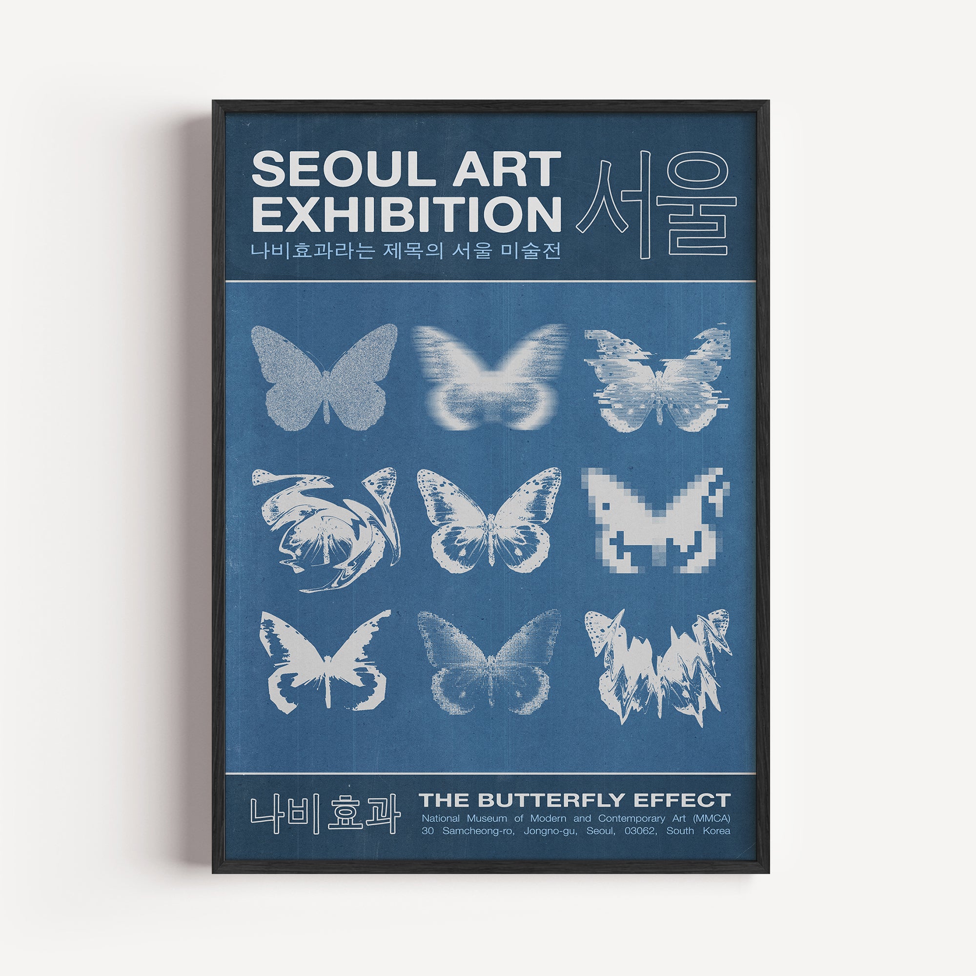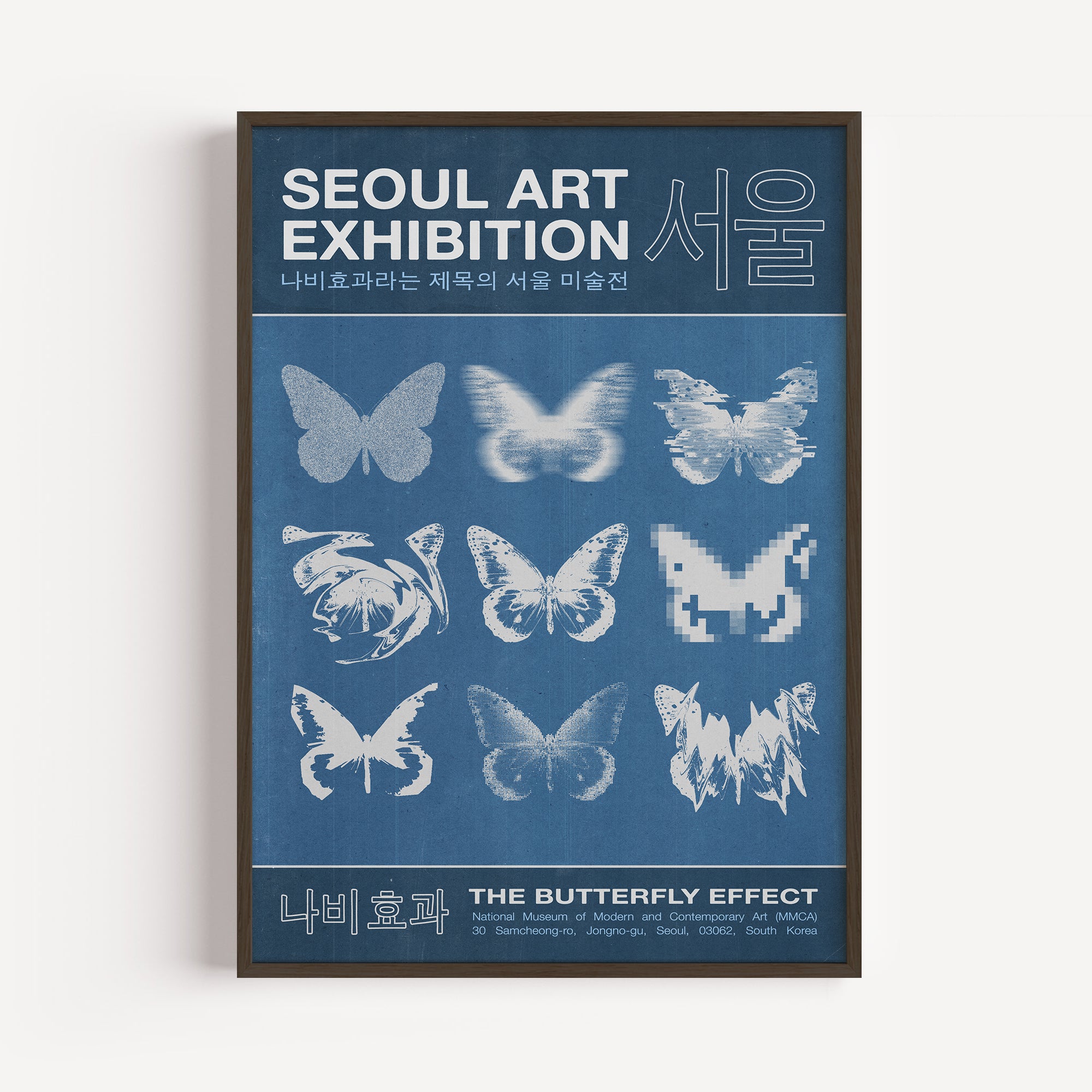 Discover the captivating "Butterfly Effect" poster, featuring nine vibrant abstract butterflies that symbolize transformation and creativity. This visually striking artwork promotes a must-see exhibition in Seoul, South Korea, perfect for art enthusiasts looking to celebrate innovative design. Brighten your space with this unique piece and let the fluttering motifs inspire your imagination every day.