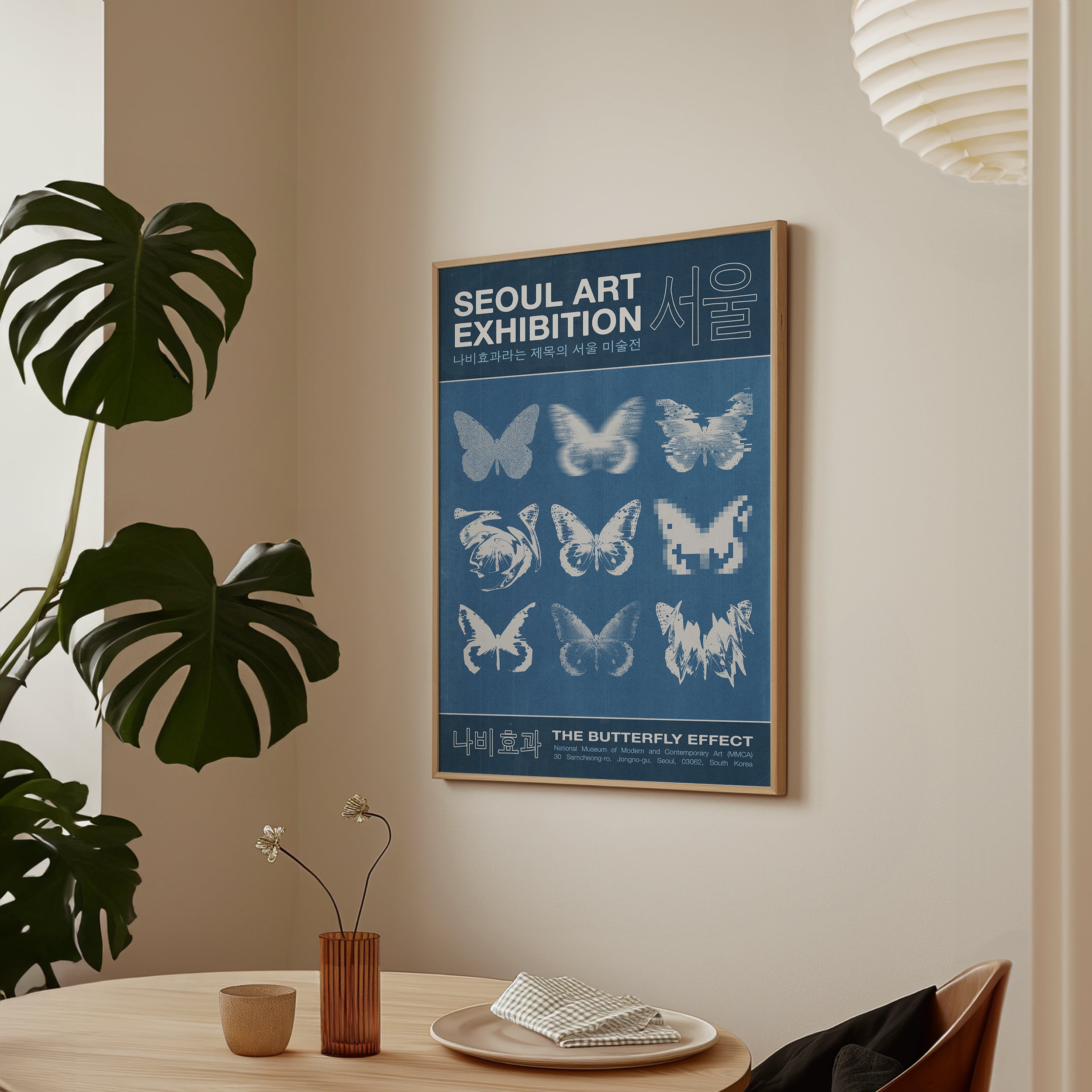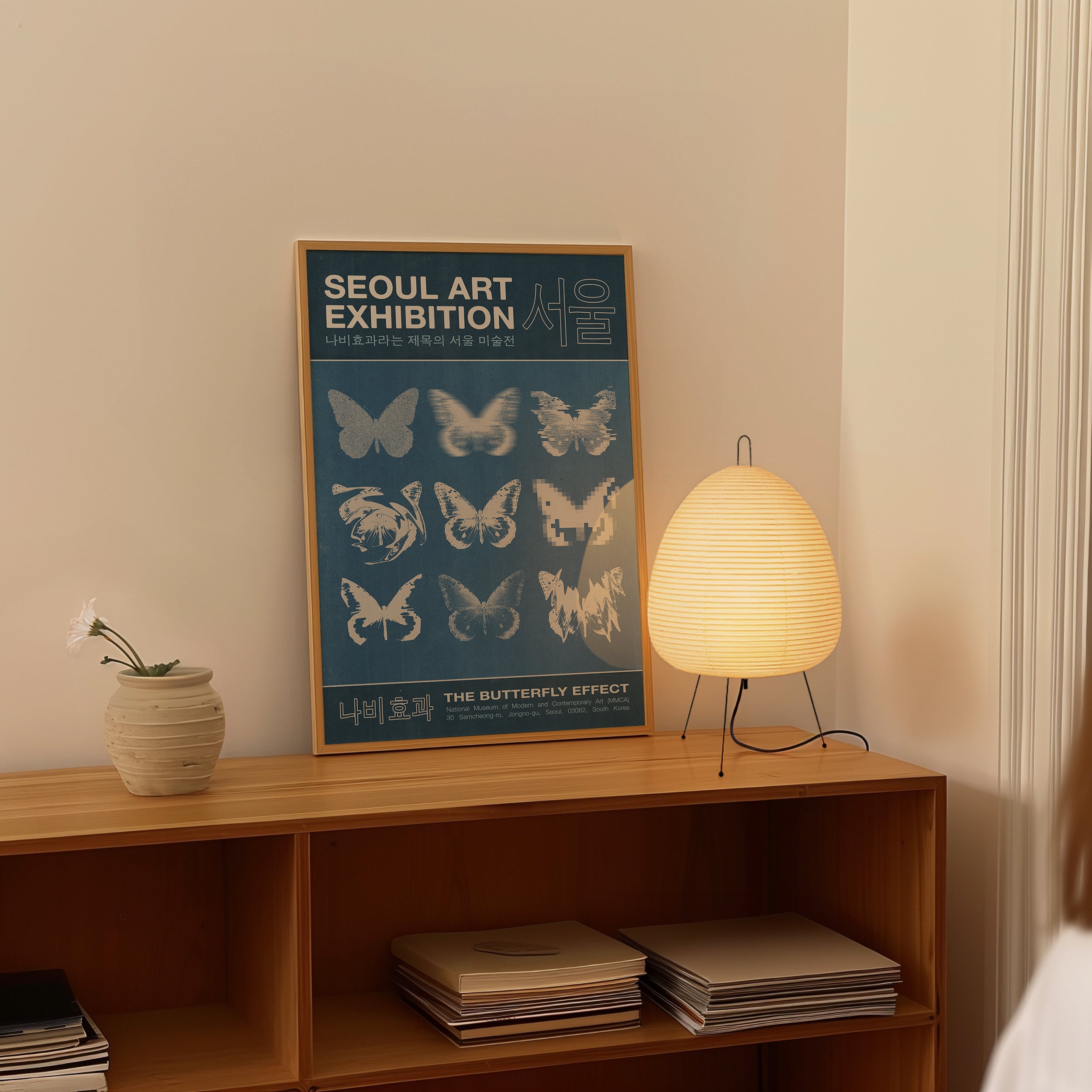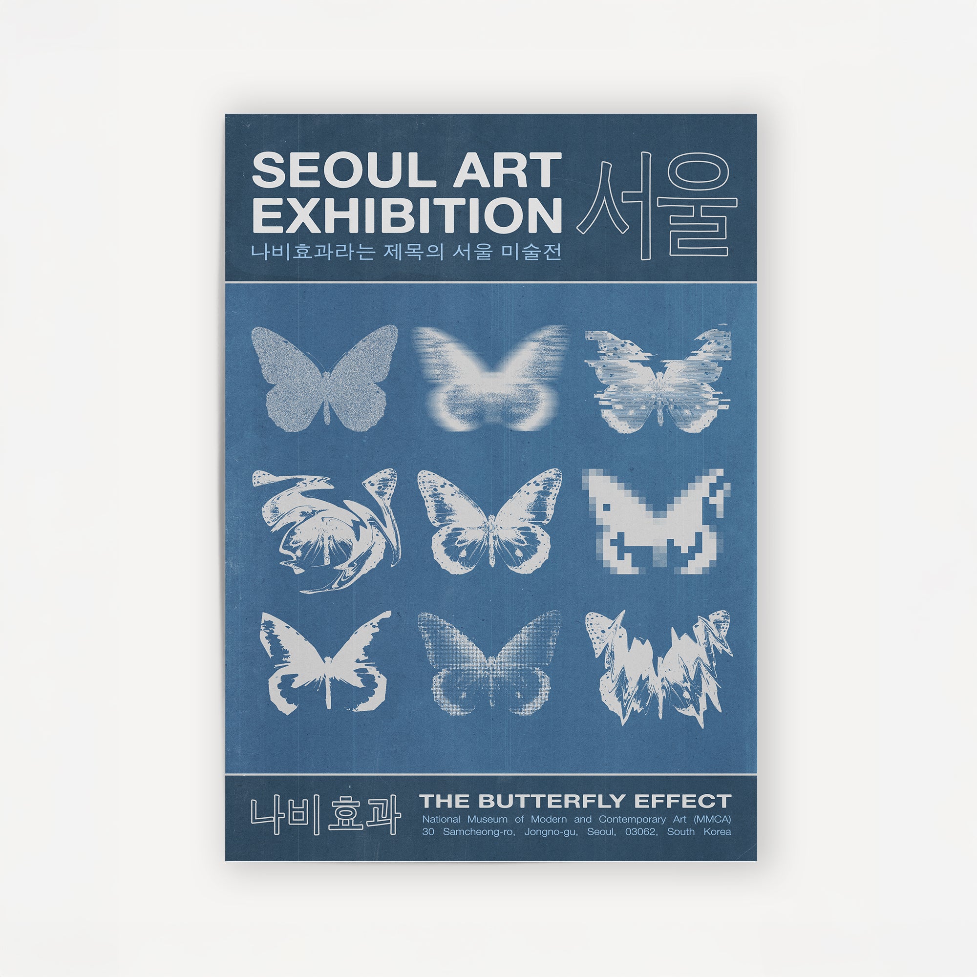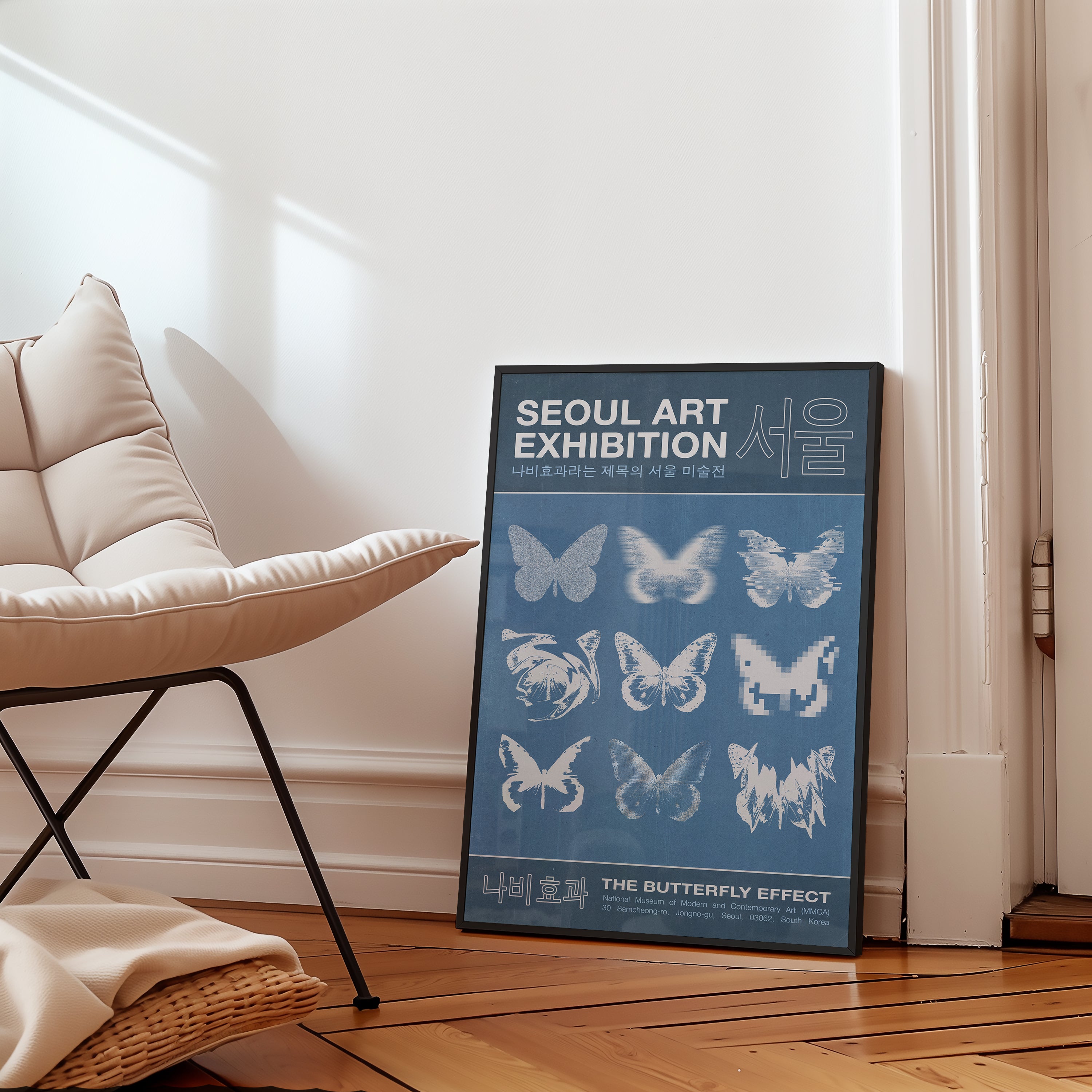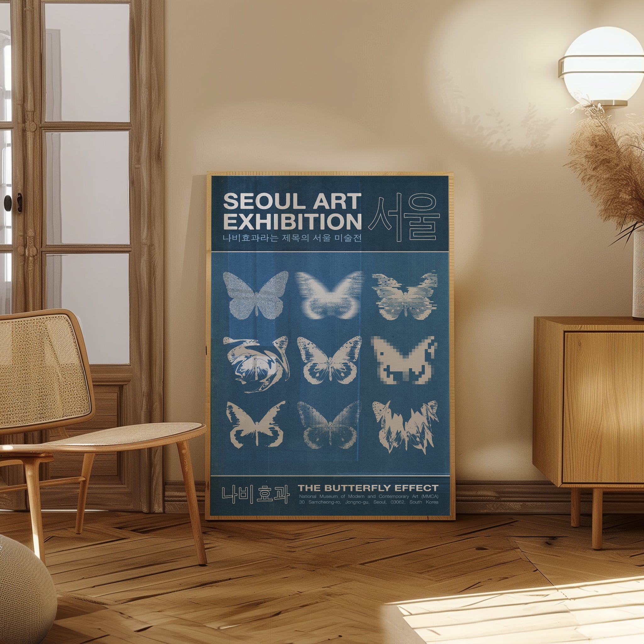Discover the captivating "Butterfly Effect" poster, featuring nine vibrant abstract butterflies that symbolize transformation and creativity. This visually striking artwork promotes a must-see exhibition in Seoul, South Korea, perfect for art enthusiasts looking to celebrate innovative design. Brighten your space with this unique piece and let the fluttering motifs inspire your imagination every day.