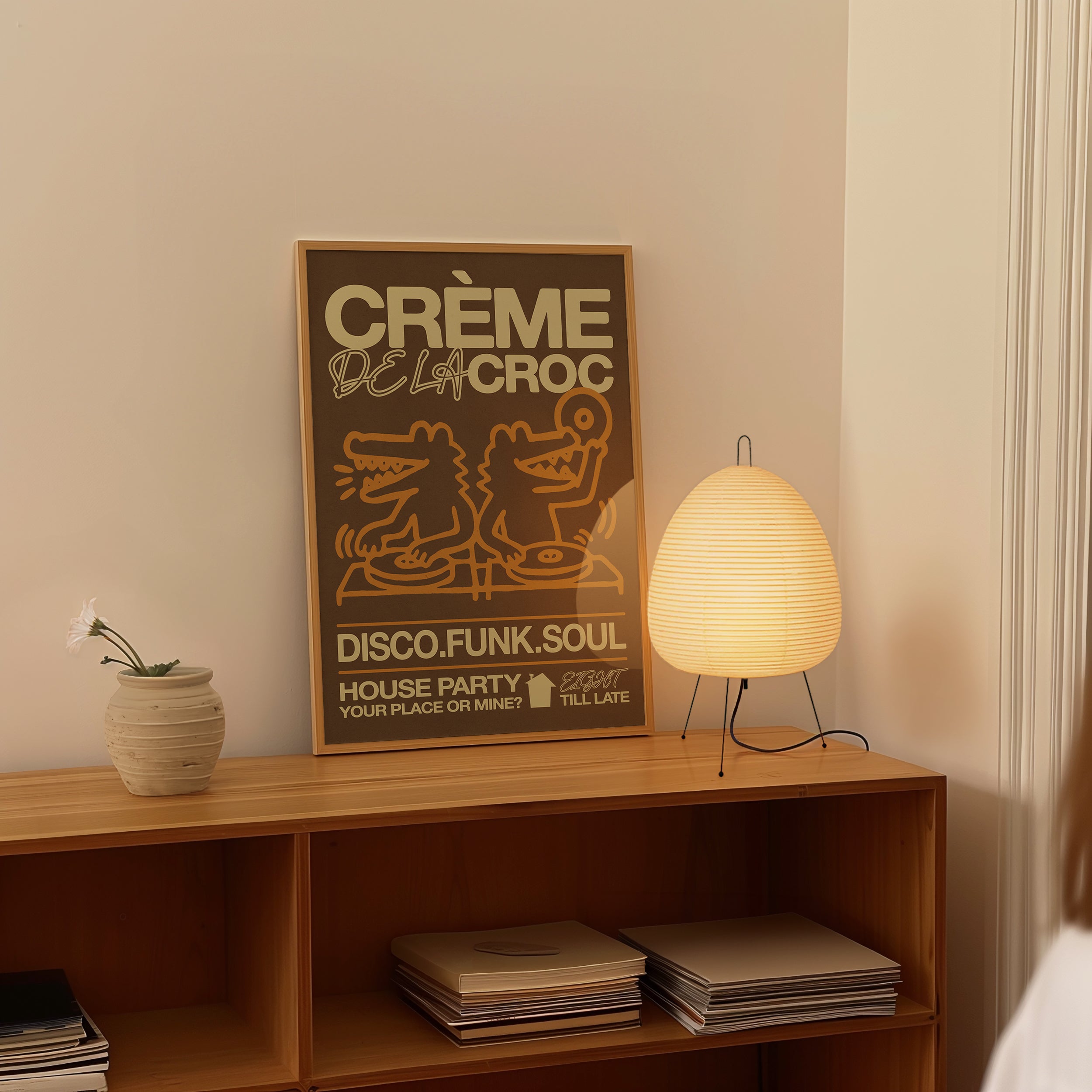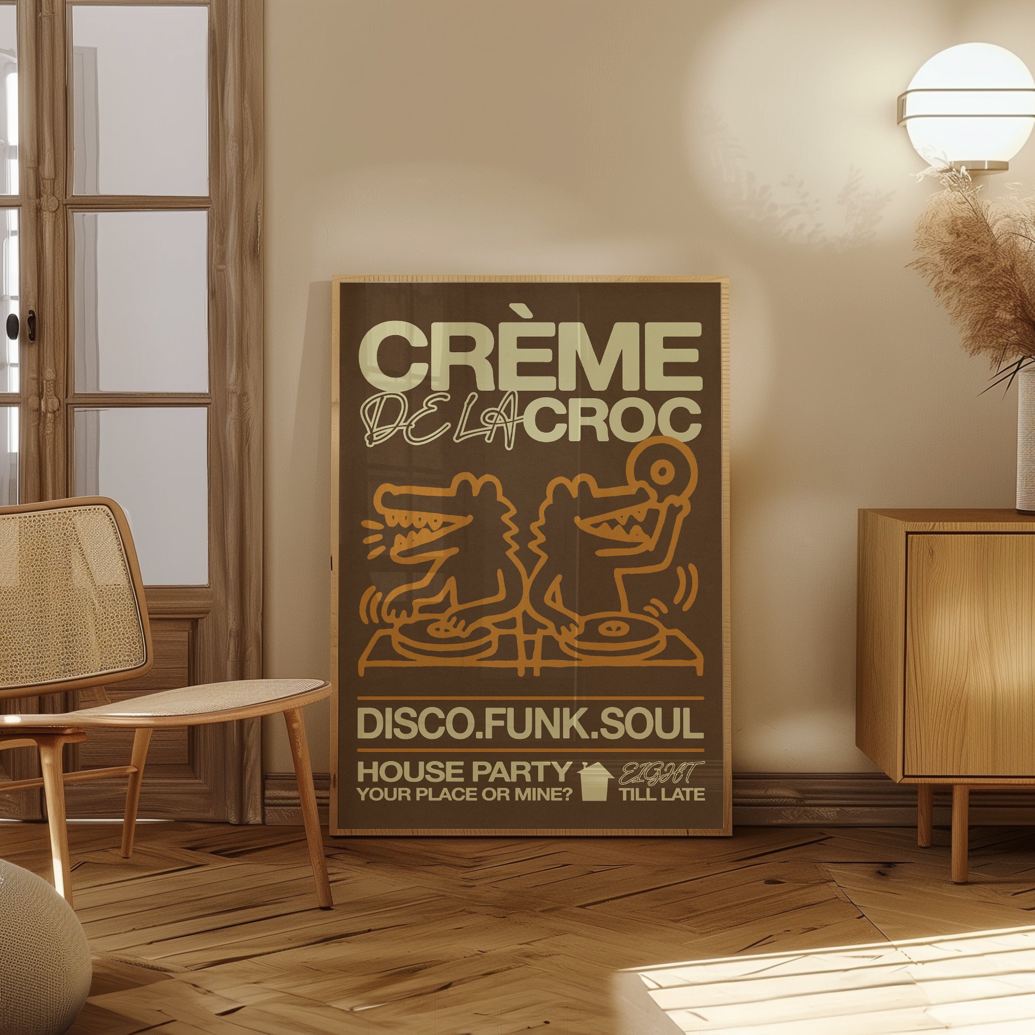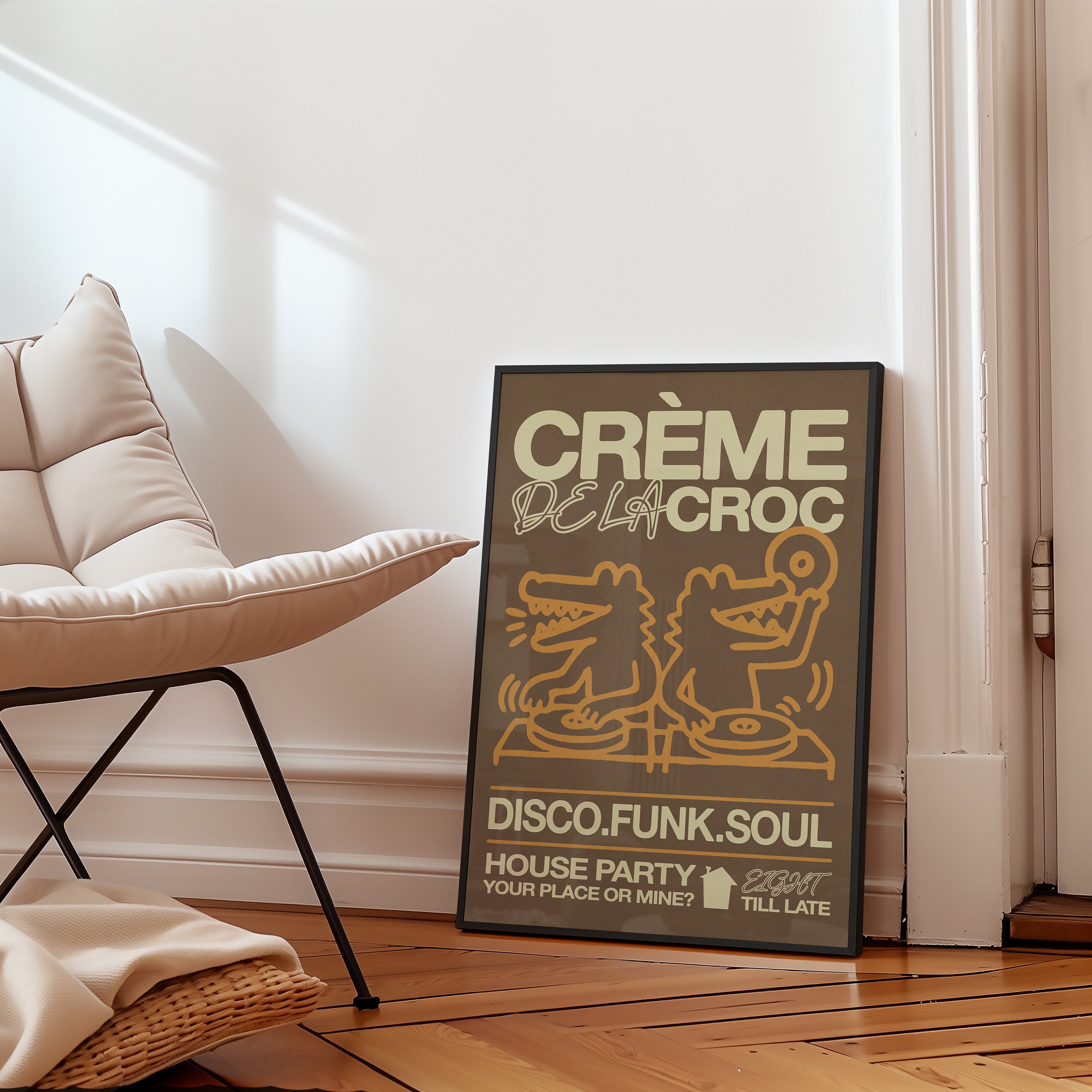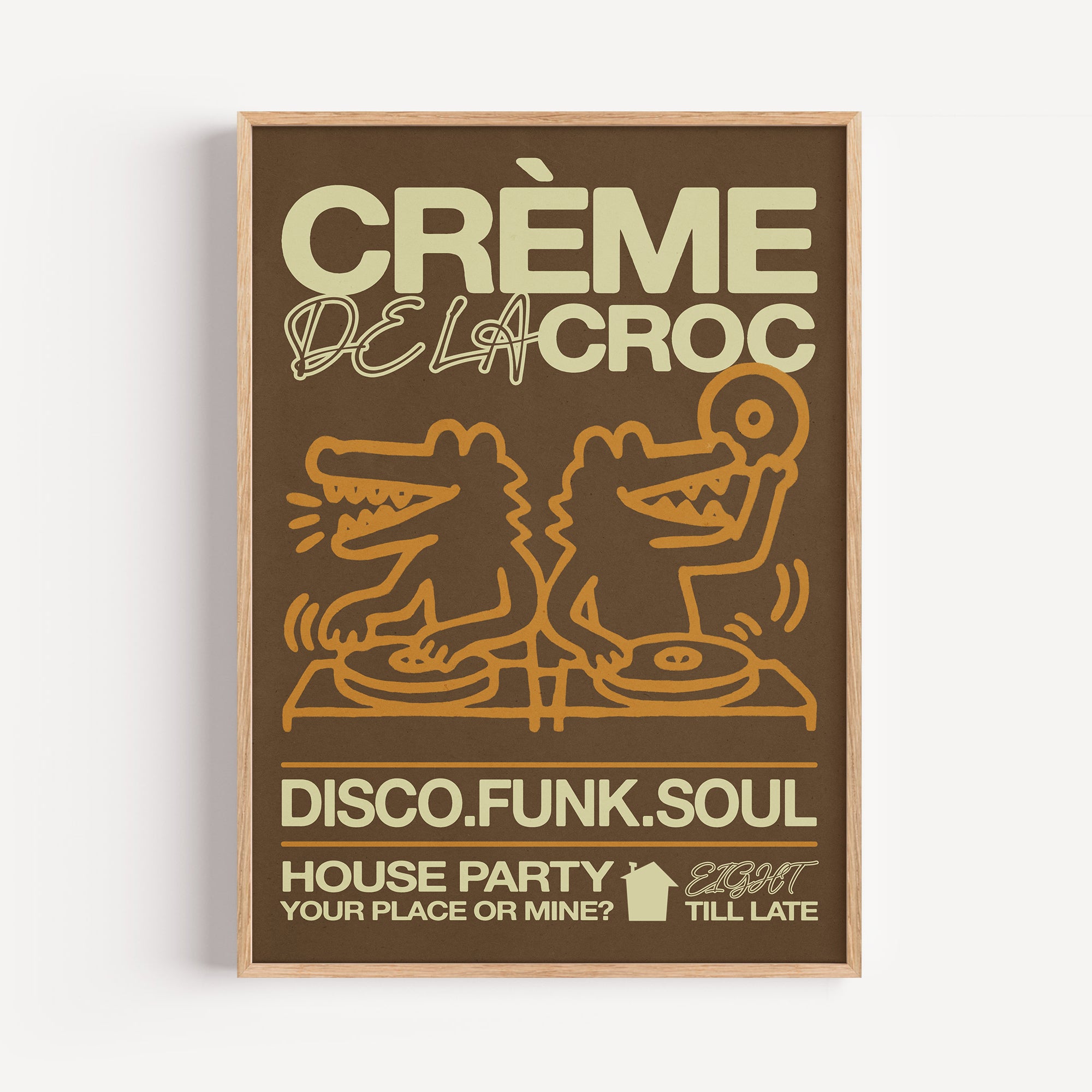 Bring the fun to your space with this playful "Creme De La Croc" poster. Featuring a lively scene of crocodiles DJing at a house party, it’s perfect for adding a splash of quirky energy and good vibes to any room. Ideal for music lovers and animal fans alike, this design captures the party spirit with a cheeky twist.