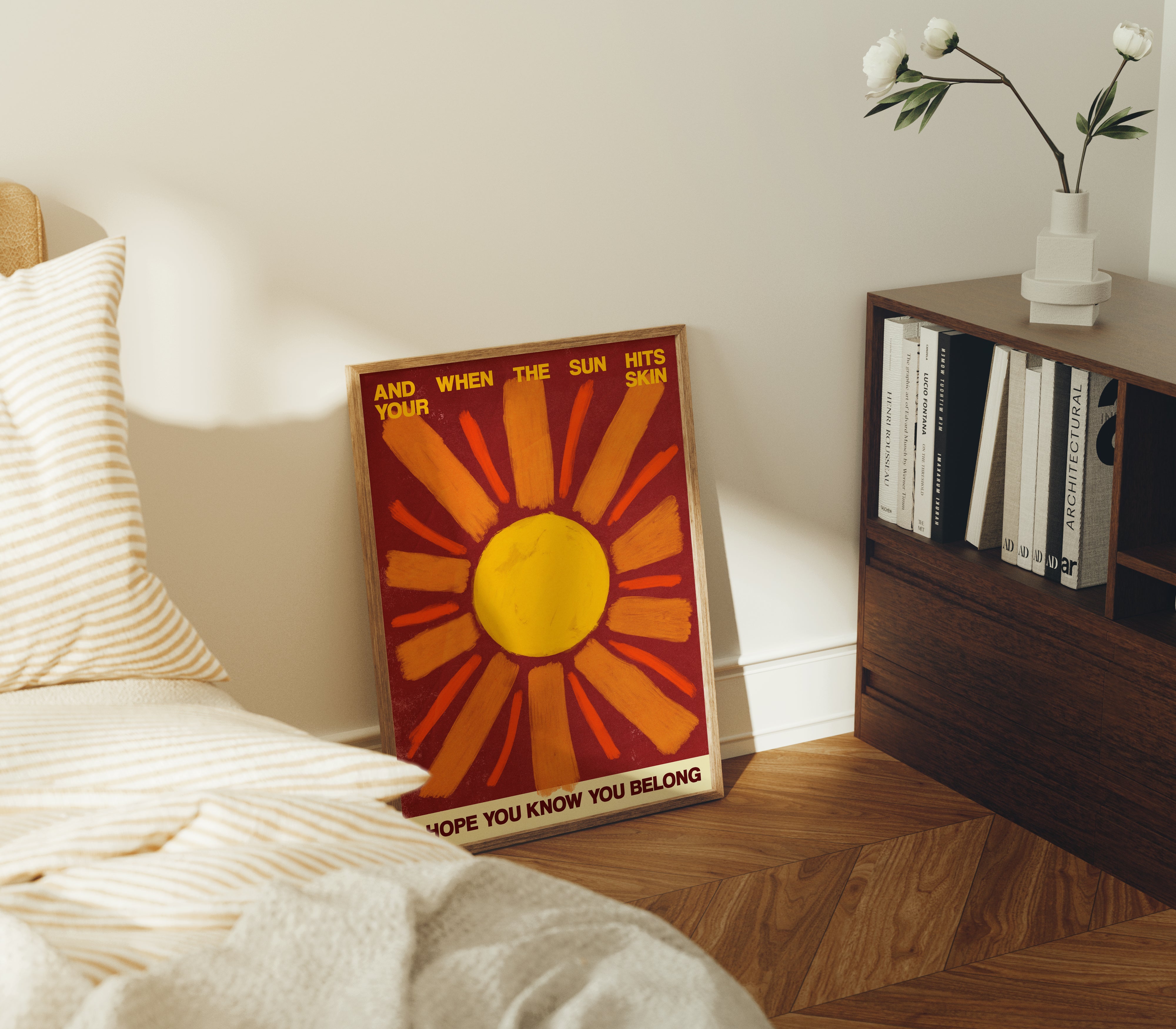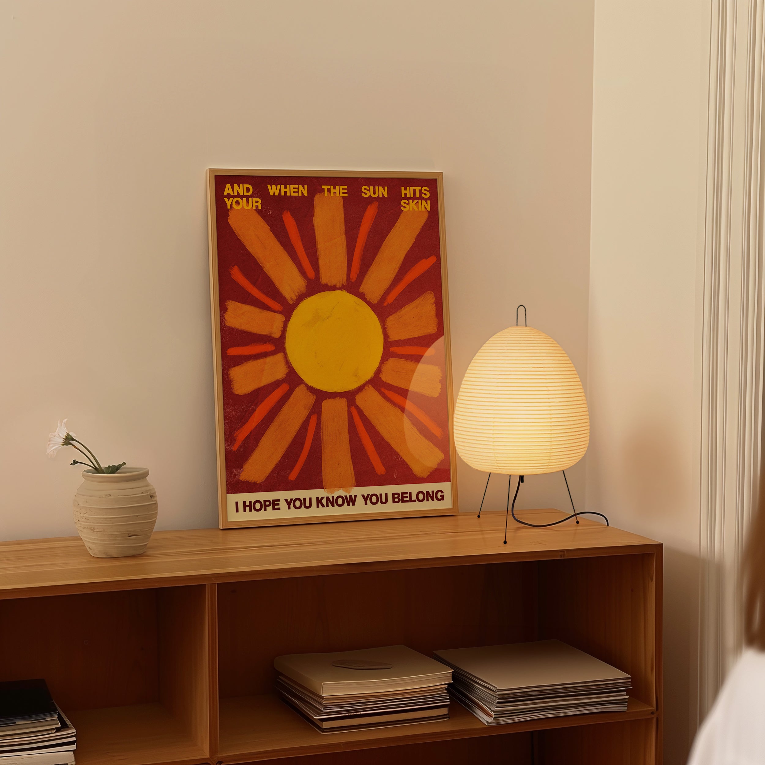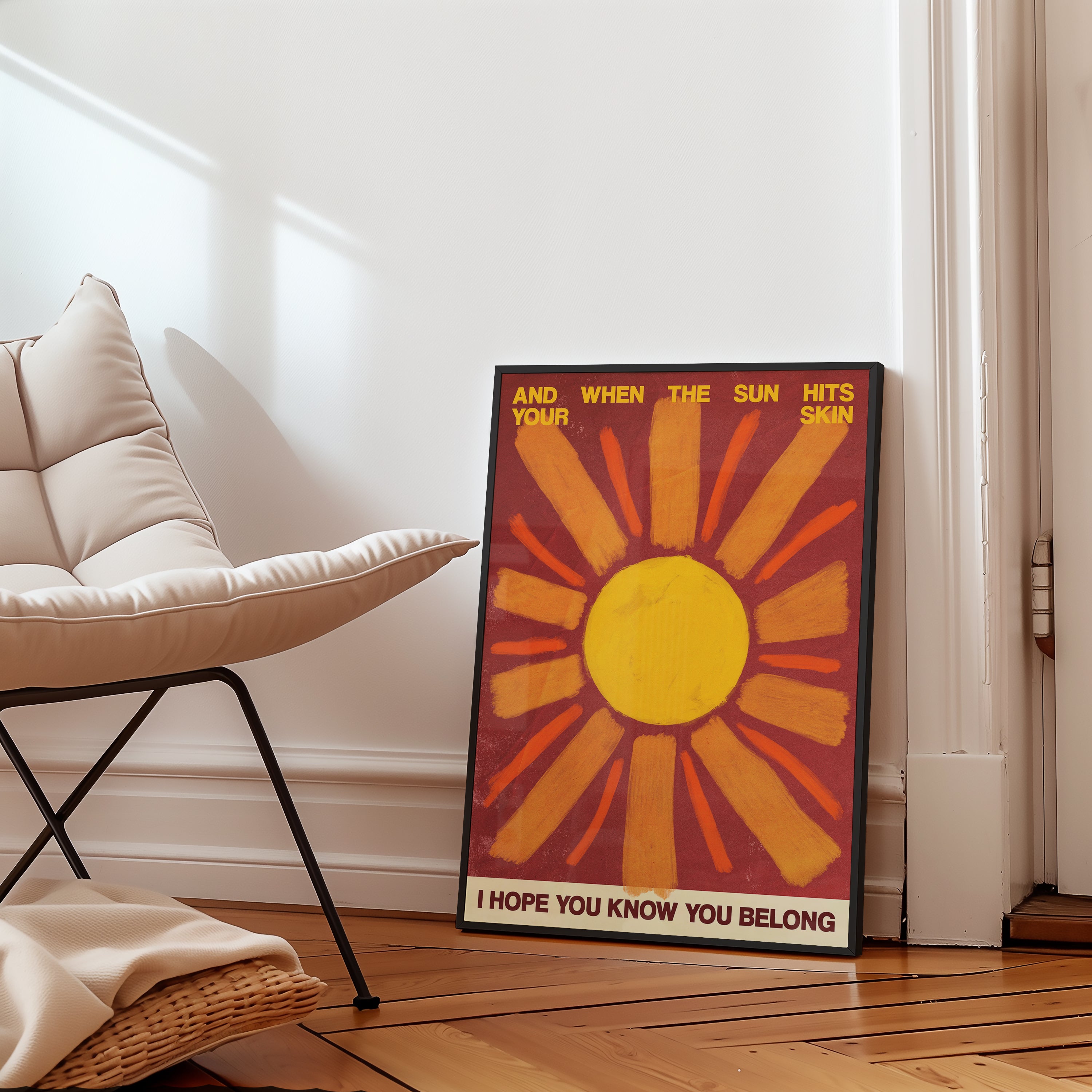 Brighten your space with this vibrant illustrated sun print, featuring a cheerful design and an uplifting quote to inspire joy every day. Perfect for adding a playful splash of color and positivity to any room.