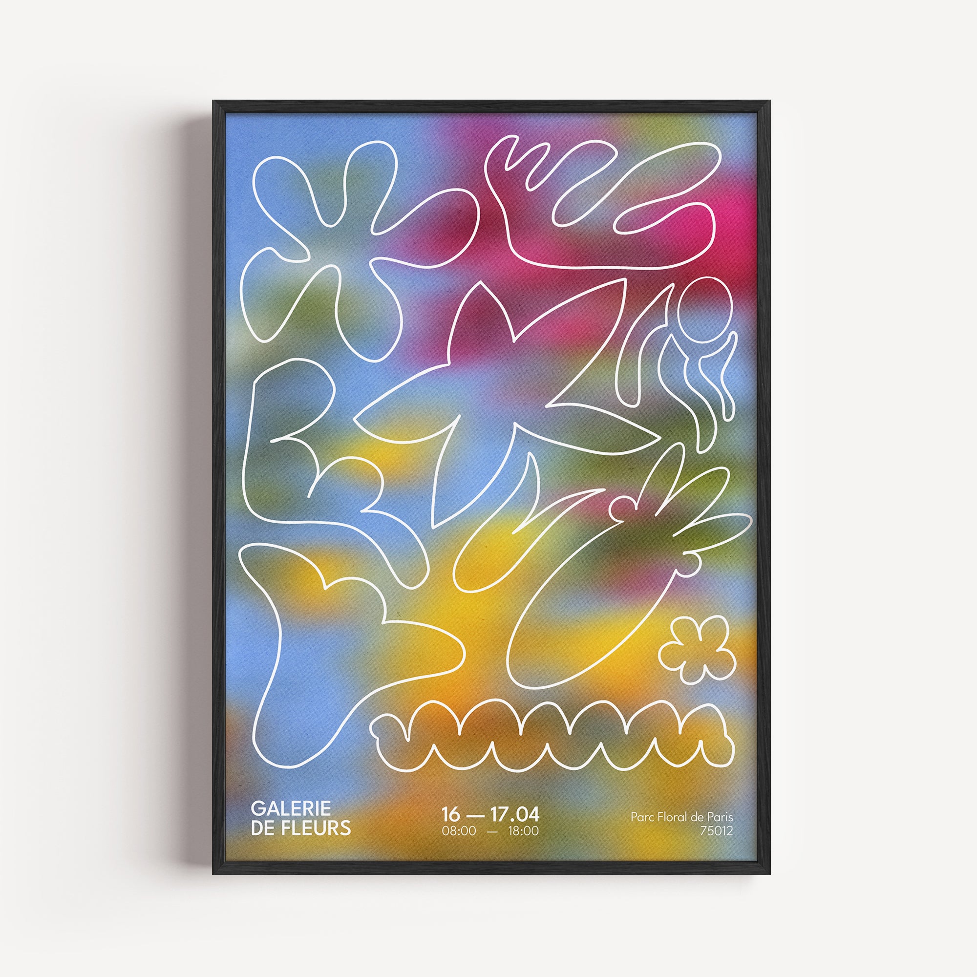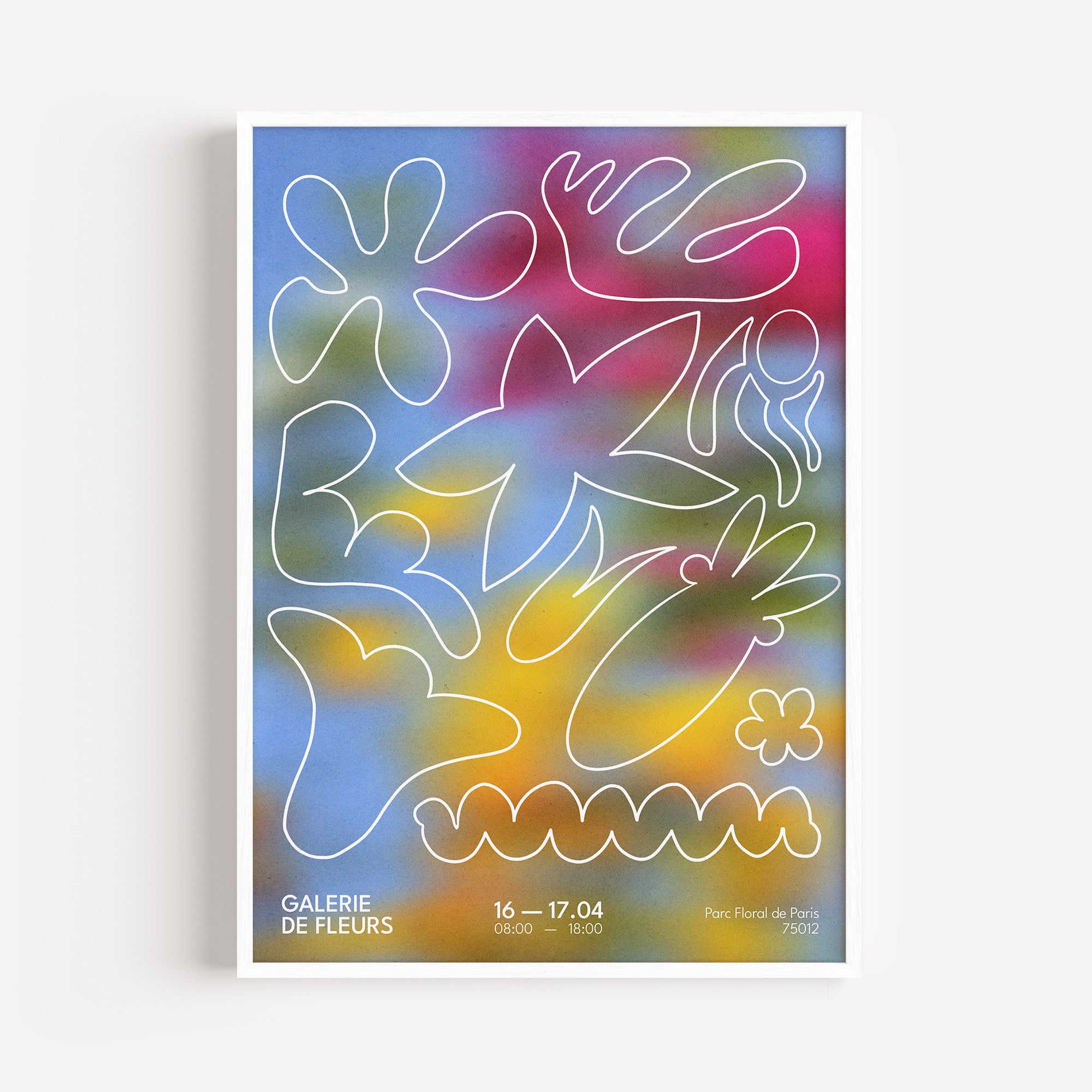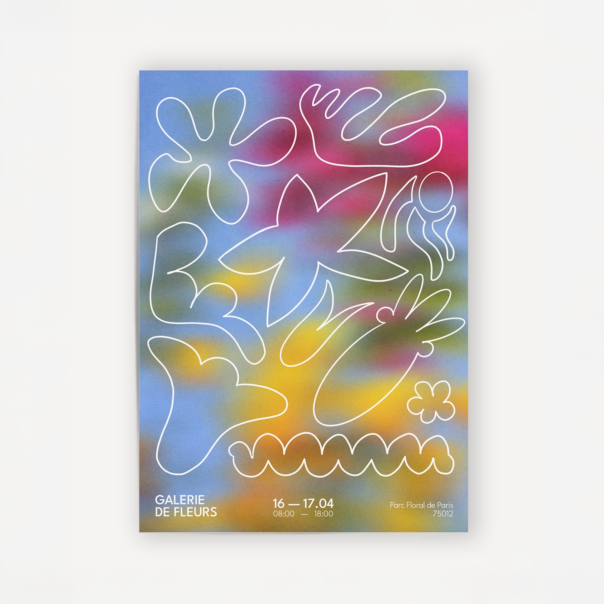Galerie de Fleurs captures attention with an ethereal blend of softly blurred flowers and intricate hand-drawn floral details. This abstract poster not only invites curiosity but also creates an elegant atmosphere perfect for promoting your gallery exhibition. Its layered design draws viewers in, inspiring them to explore the art within—making it an essential piece for showcasing creativity and sophistication.