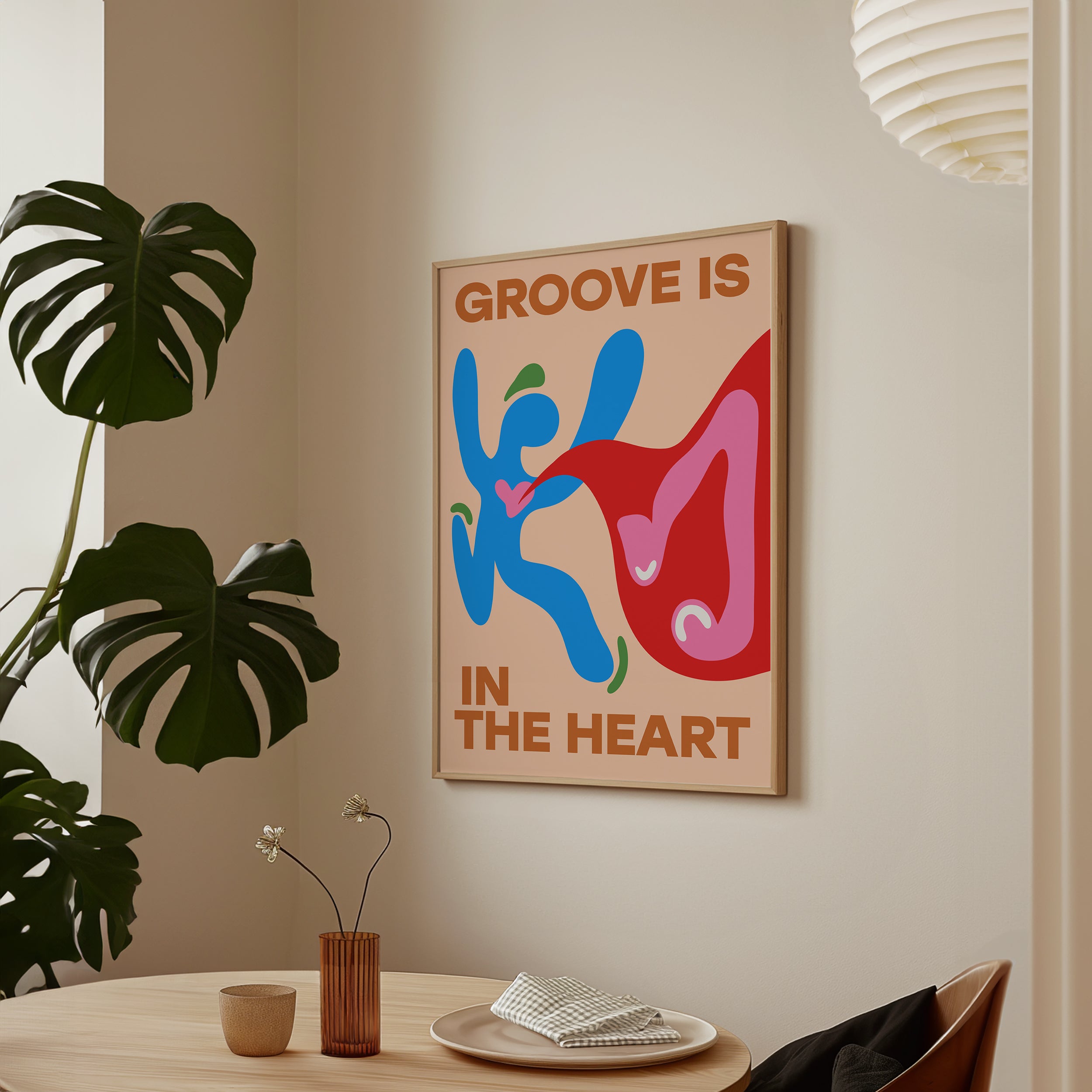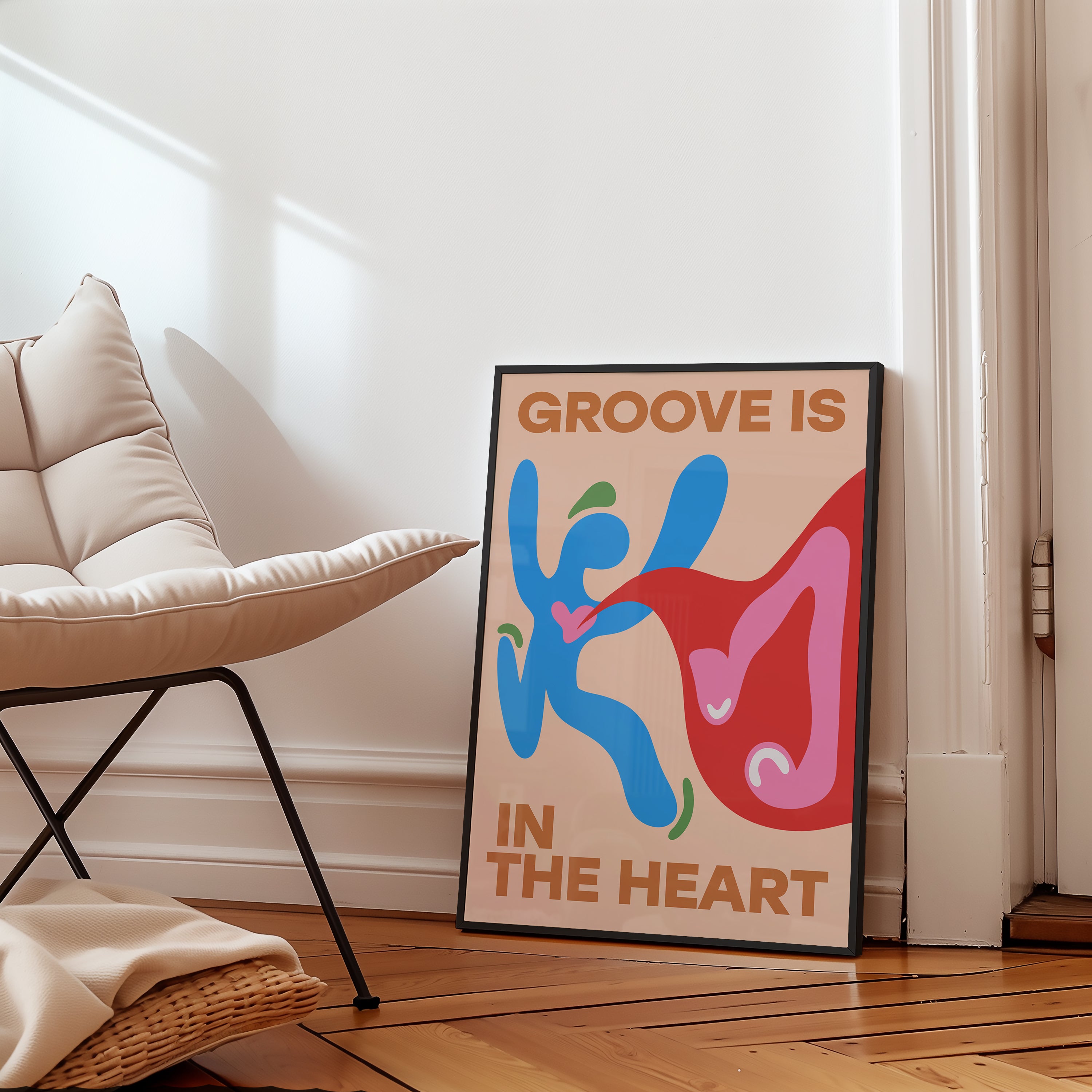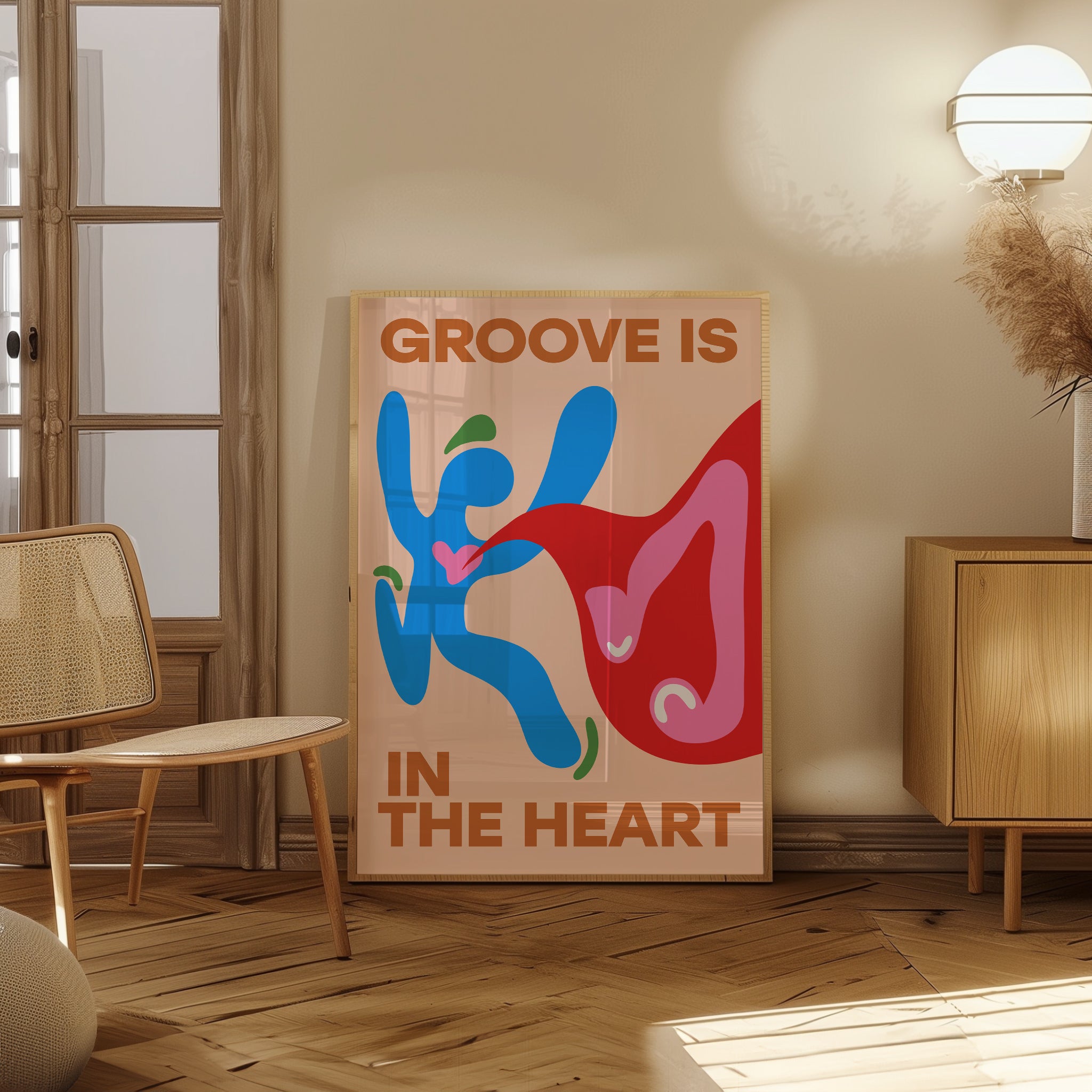 Celebrate good vibes with the Groove Is In The Heart poster! This playful design brings retro charm and upbeat energy to any space, making it perfect for music lovers and style aficionados alike. Brighten your room with a splash of fun that keeps the rhythm alive every day.