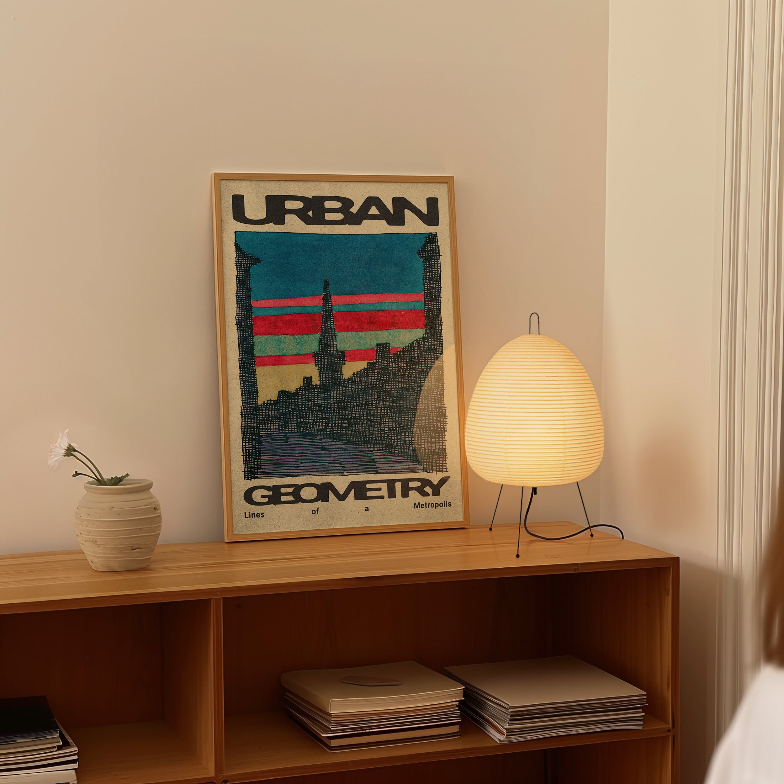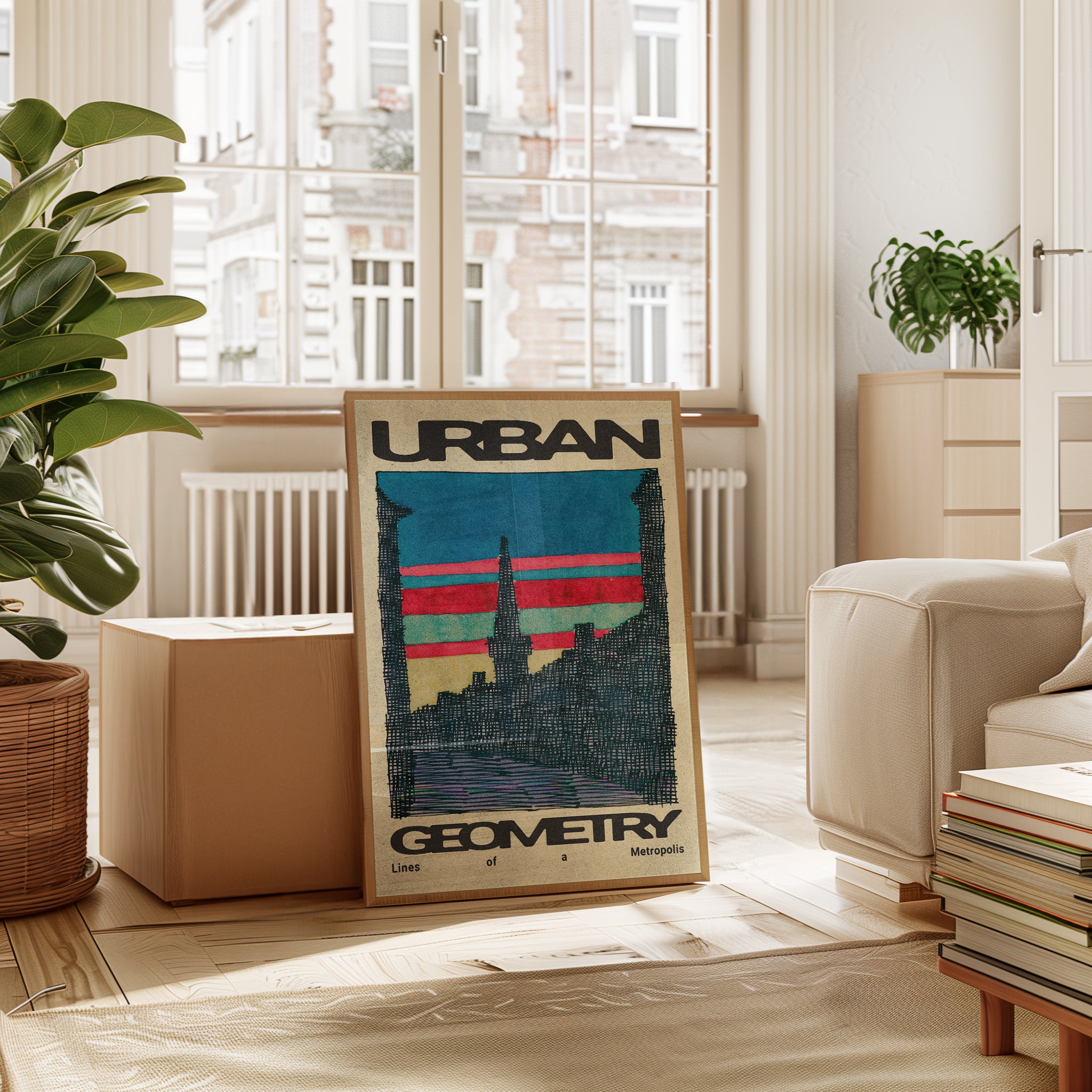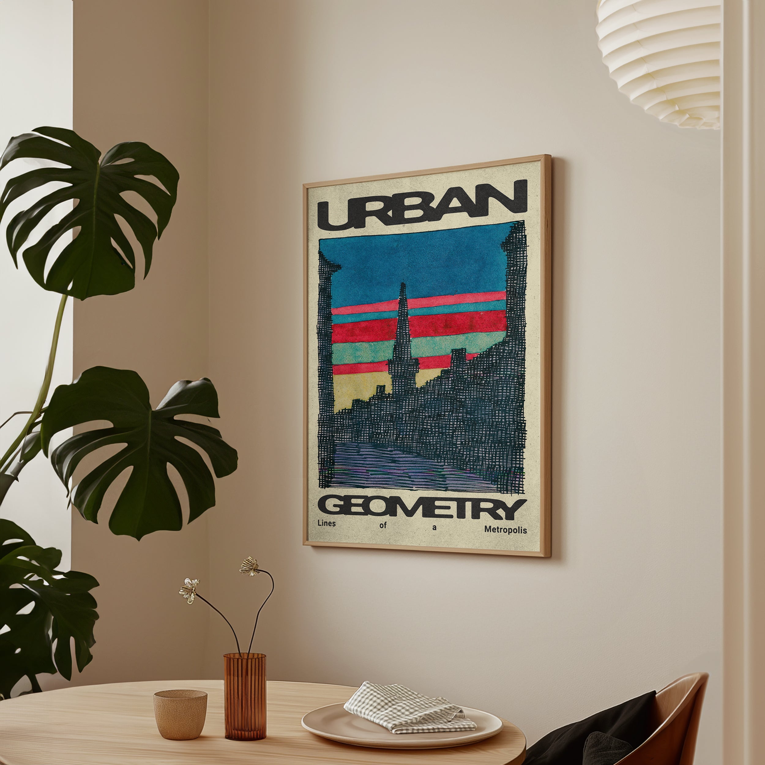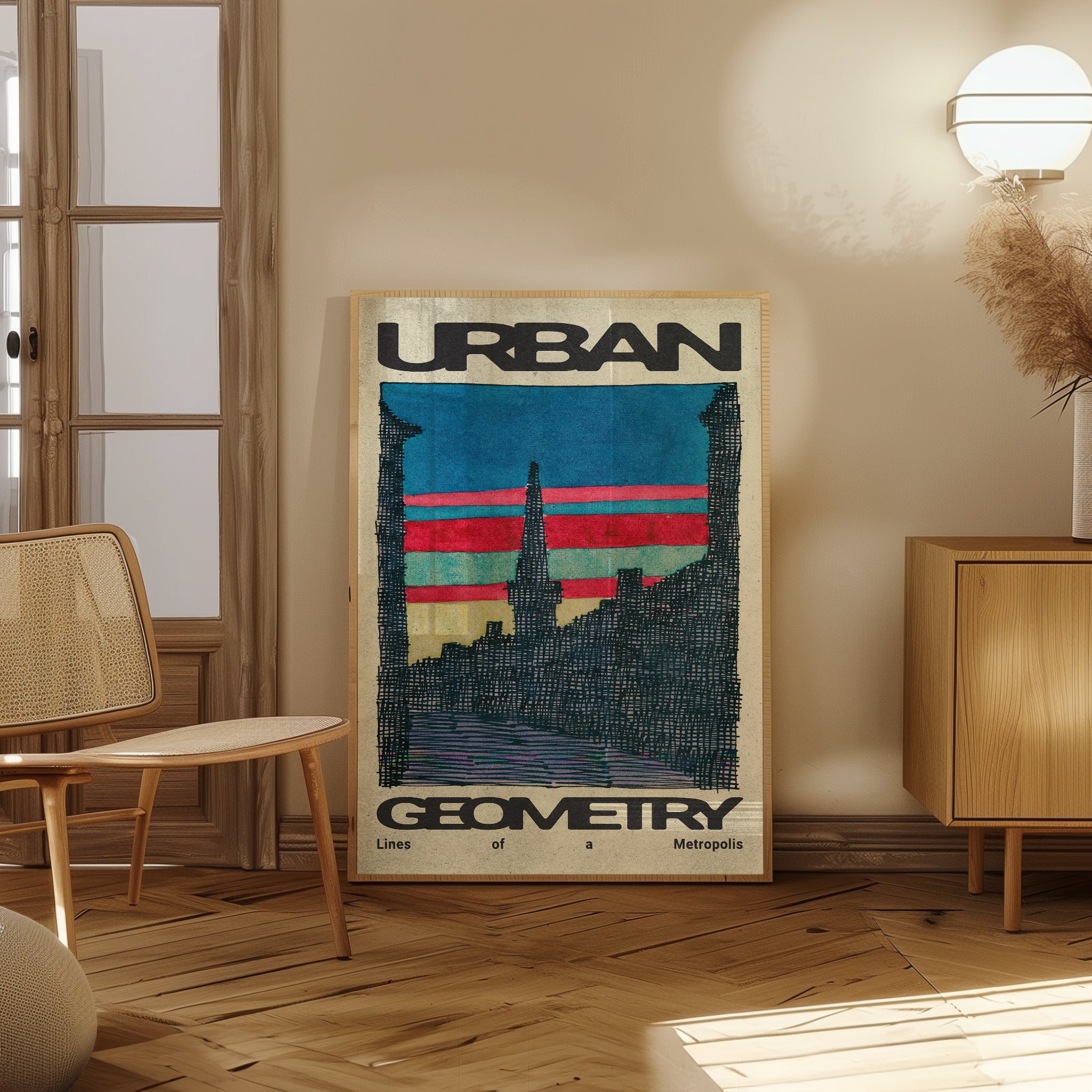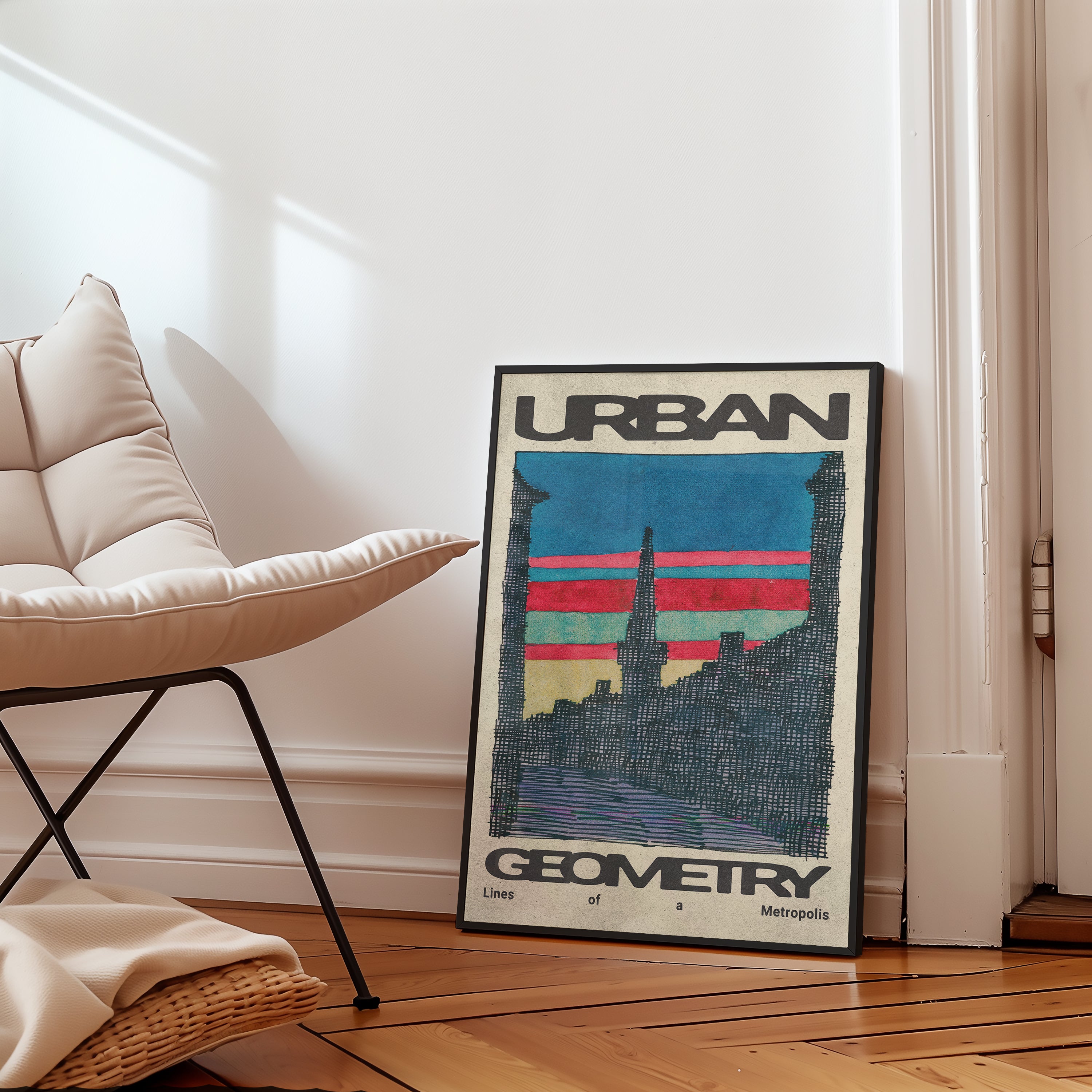 Urban Geometry features an abstract city skyline rendered with expressive, rough line-work that captures the raw energy of urban life. This sophisticated piece balances spontaneity and structure, adding a dynamic yet refined touch to contemporary interiors. It’s ideal for those who appreciate an artistic interpretation that celebrates the imperfect beauty of cityscapes.
